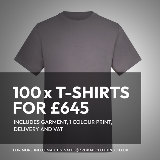 Design must be the same across all garments and must not measure more than 39cm x 49cm. The offer excludes our jumbo printing, all-over printing and our cut and sew service. Offer applies to standard placement prints only (front, back or sleeve) and is limited to one placement print per offer. Artwork must be a single colour print on the AWDis 180 T-Shirts (AT002) only. All garments must be the same colour and split across the following sizes: small, medium, large, XL and 2XL. 3rd Rail will supply the garments, they cannot be supplied by the customer. If a garment size or colour is out of stock the customer must select an alternative in the same style. The customer is responsible for providing high quality artwork (at least 300dpi at the correct print size). Offer is valid on new orders only and cannot be applied to ones that have already been placed. Please allow a 15 working day turnaround on all orders from the point of approval.