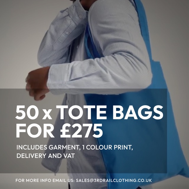 Design must be the same across all bags and must not measure more than 27cm x 27cm. The offer excludes our jumbo printing, all-over printing and cut and sew service. The offer applies to standard placement prints only (front or back) and is limited to one placement print per offer. Artwork must be supplied as a single colour print on Westford Mill WM101 tote bags only. All bags must be the same colour. 3rd Rail will supply the bags and they cannot be supplied by the customer. If a bag colour is out of stock, an alternative in the same style must be selected. The customer is responsible for providing high quality artwork (minimum 300dpi at the correct print size). The offer applies to new orders only and cannot be applied to existing orders. Please allow up to 15 working days for production from the point of approval.